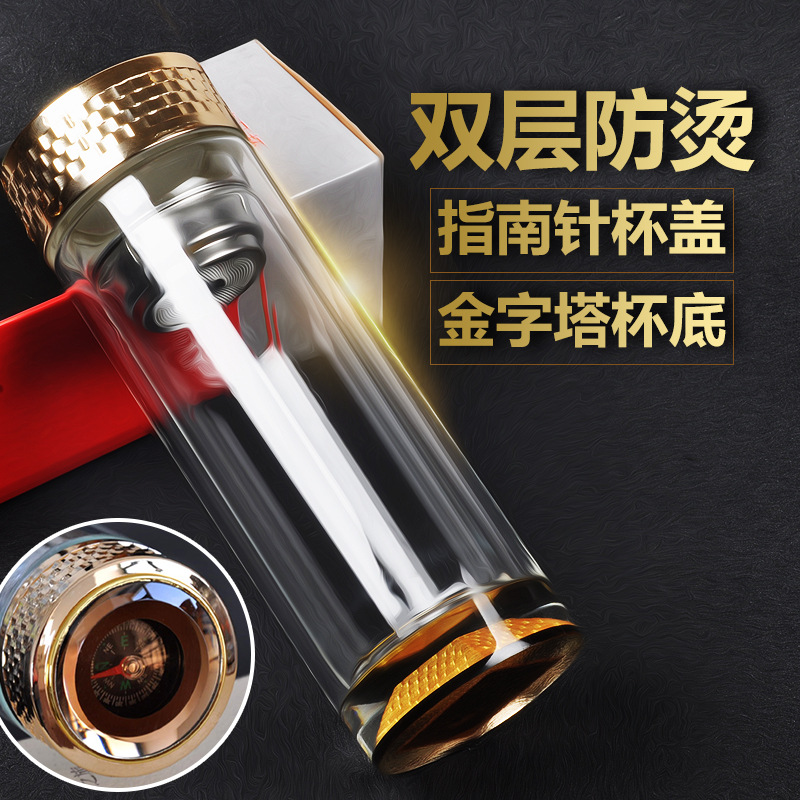 2020原创高档指南针双层玻璃杯男士商务水杯茶杯便携定制广告印字热门设计联盟服务商
